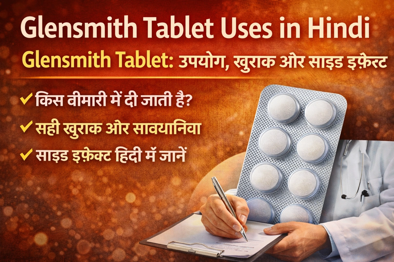 Glensmith Tablet एक डॉक्टर द्वारा लिखी जाने वाली दवा है। इसे आम दवा की तरह बिना सलाह के नहीं लेना चाहिए। जब लोग इंटरनेट पर glensmith tablet uses in hindi सर्च करते हैं, तो वे यह जानना चाहते हैं कि यह दवा किस काम आती है, कैसे ली जाती है और क्या यह सुरक्षित है।